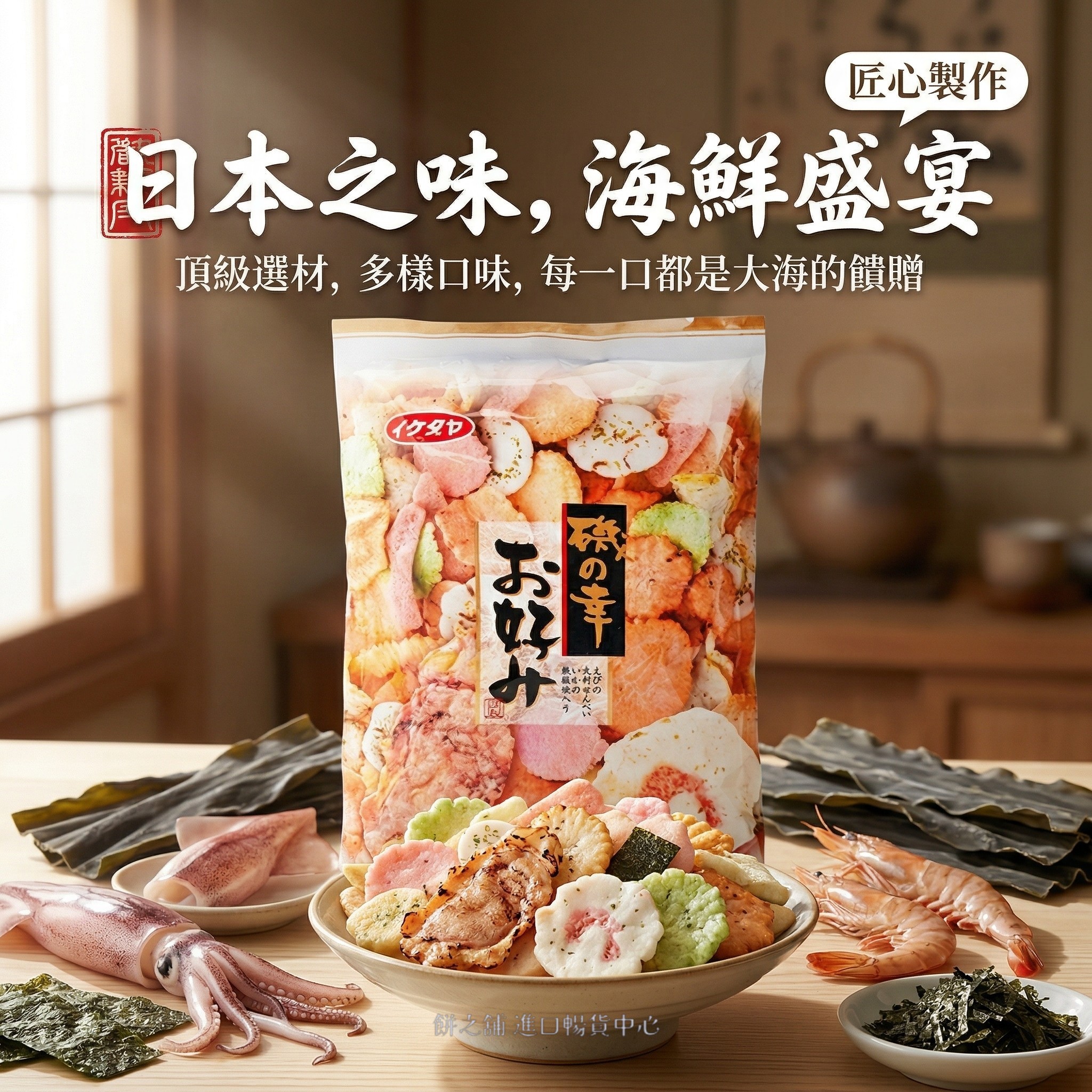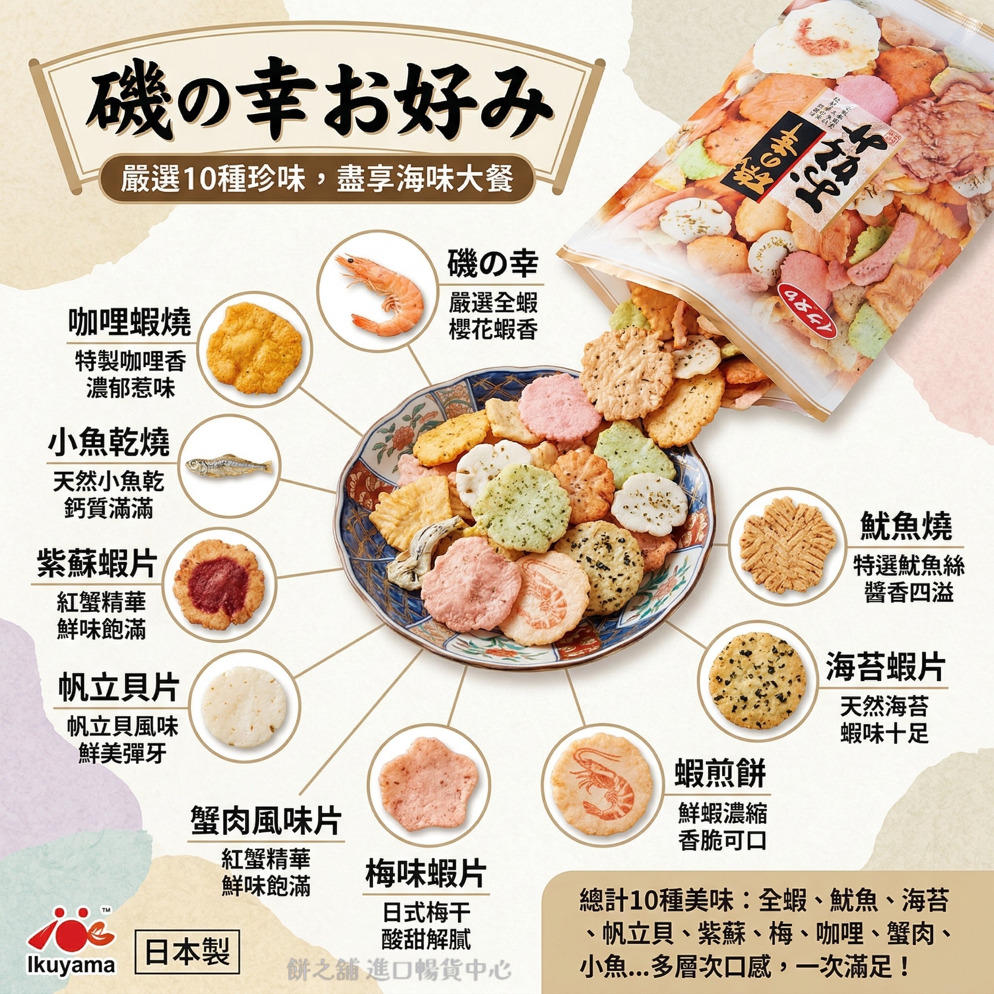 *本產品含有魷魚,麩質穀物,大豆,魚製品,蝦,芝麻,花生,牛奶,扇貝,雞蛋,過敏體質者請勿食用